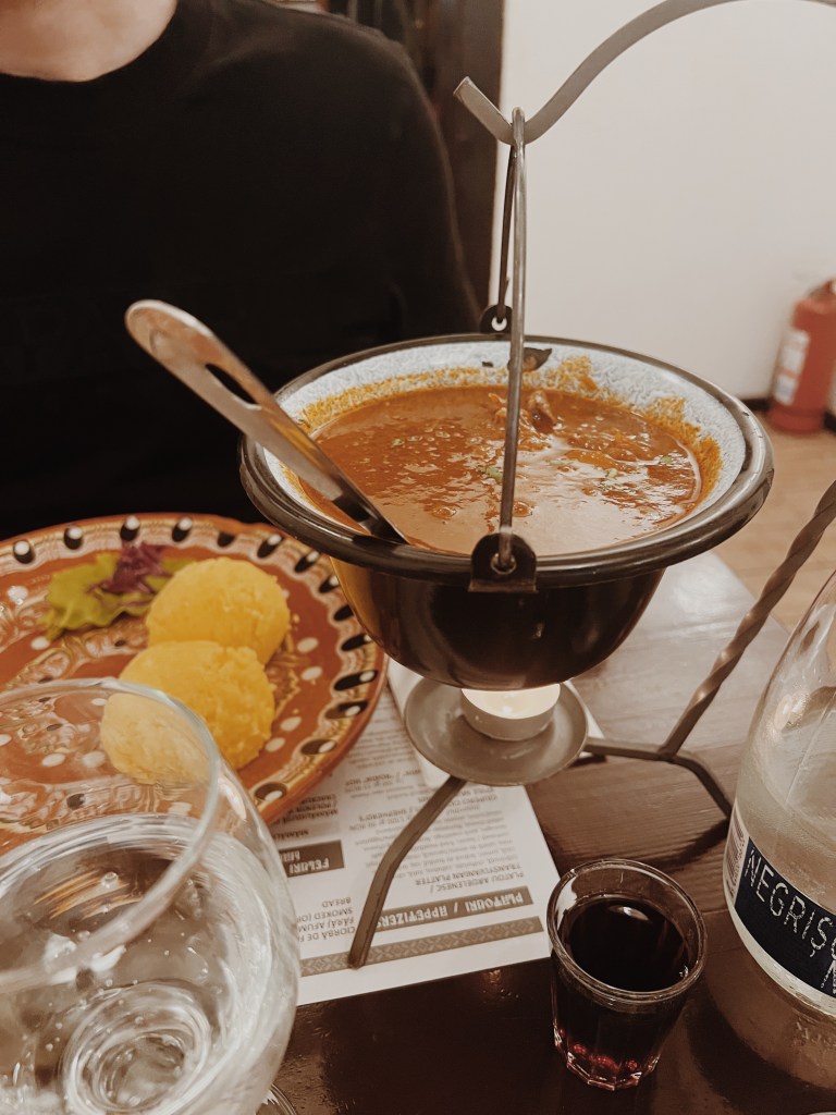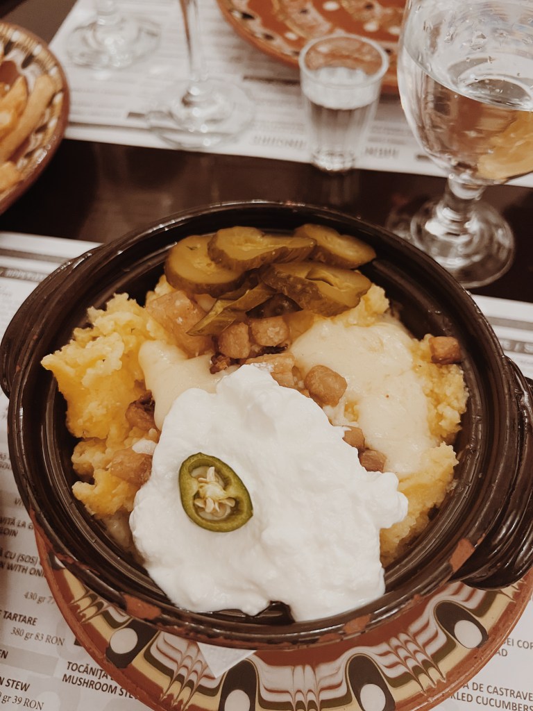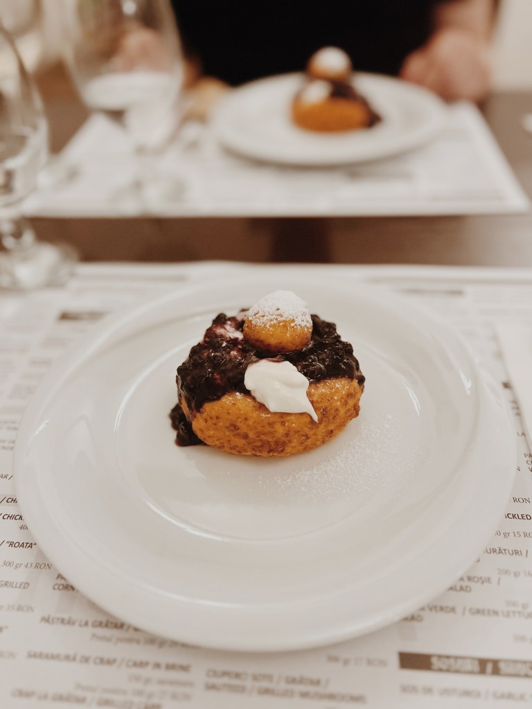 Roata– The aforementioned couple told me that the dessert I must try before I leave was Papanasi. Given this, while on a walking tour, I asked the guide where I might find the best Papanasi in town. He recommended us to try his favorite restaurant. He had recently celebrated his birthday at this spot. Roata didn’t disappoint. Delicious traditional Romanian food. I went with a German friend I met at the hostel and we tried the Polenta with cheese & pork cracklings as well as the Venison goulash stew. Of course we finished with some Papanasi, which kind of like a donut with sweet cheese + jam.