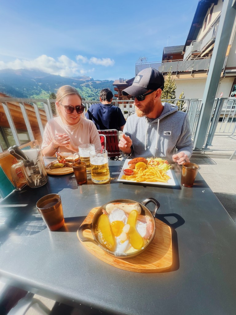 I mostly bought groceries since this country is so expensive, but when I was in Grindelwald, the waitress accidentally thought I was with the couple ahead of me in line and asked “table for 3?” The couple chuckled and said “no, just two” before turning to me to stay “unless you want to join?” I don’t think they realized that I would enthusiastically take them up on their offer, since we all know I love meeting new people! I quickly found out that they were from Buffalo, NY and had just arrived fresh off the plane from the US. Lunch was their first stop… and, oh by the way, it’s their honeymoon. I quickly laughed while apologizing for crashing their first honeymoon activity. Luckily they said they appreciated the warm welcome as it was their first time leaving the US. They said it helped ease the culture shock. We admired the beautiful views from Bebbis and ordered our lunch. As a treat, I suggested some chocolate fondue for dessert. They happily agreed. I wouldn’t recommend this restaurant for the food, but for a drink with a great view I can endorse it. Anyway, it was so fun chatting with them. I hope to cross paths with them again!