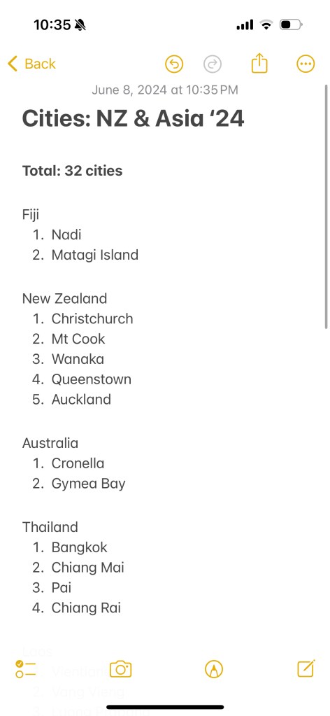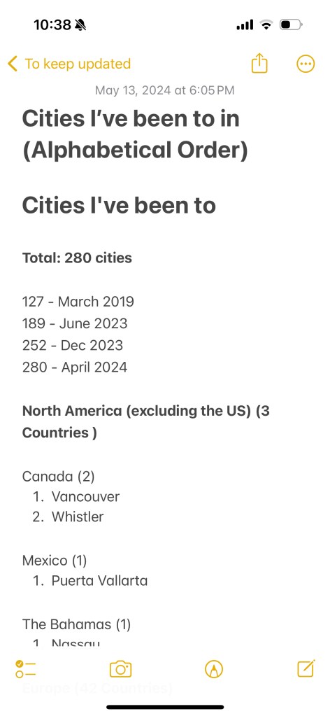 - I keep a few Notes in my Notes app on my iPhone that track where I have been. For example for each long-term trip I go on, I have a note that lists out all the cities I go to by country with a running total at the top. I also have a note that lists the countries of each trip. I have a running list that shows every city & country I have EVER gone to. I have a list of countries I’ve been to in alphabetical order and in chronological order. This may be crazy, but I love tracking this stuff haha. Some examples: