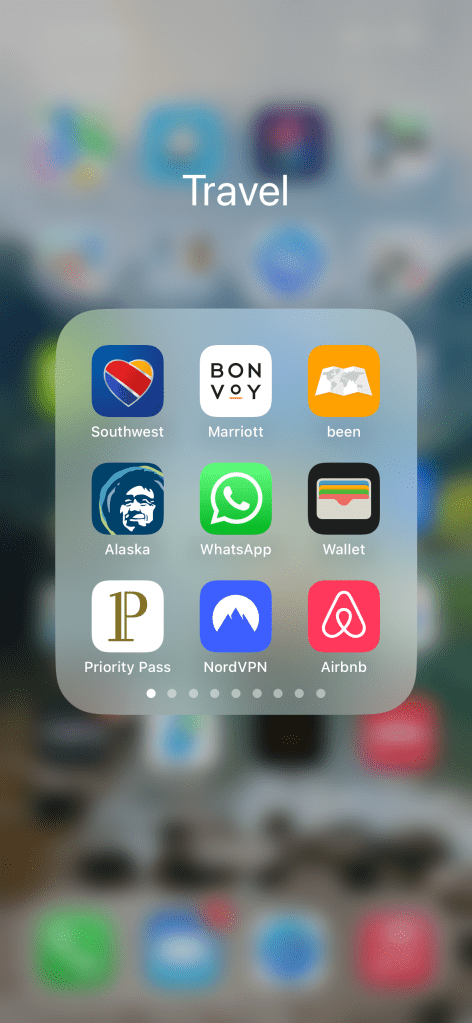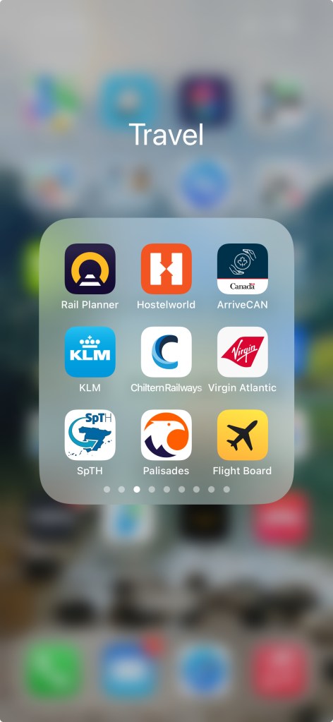 Start a Travel Folder for any apps on your phone. I download airlines & train apps so I have access to my tickets/boarding passes, VPN apps, apps that track my travels like Been & Flighty (these are very fun & cool), uber equivalents in other countries like Grab or Gojek, e-visa apps (like for Canada, Australia, or NZ), and accommodation apps like Airbnb, Hostelworld, Booking.com, & Agoda. By keeping them in a folder, it’s easy to find all my travel info.