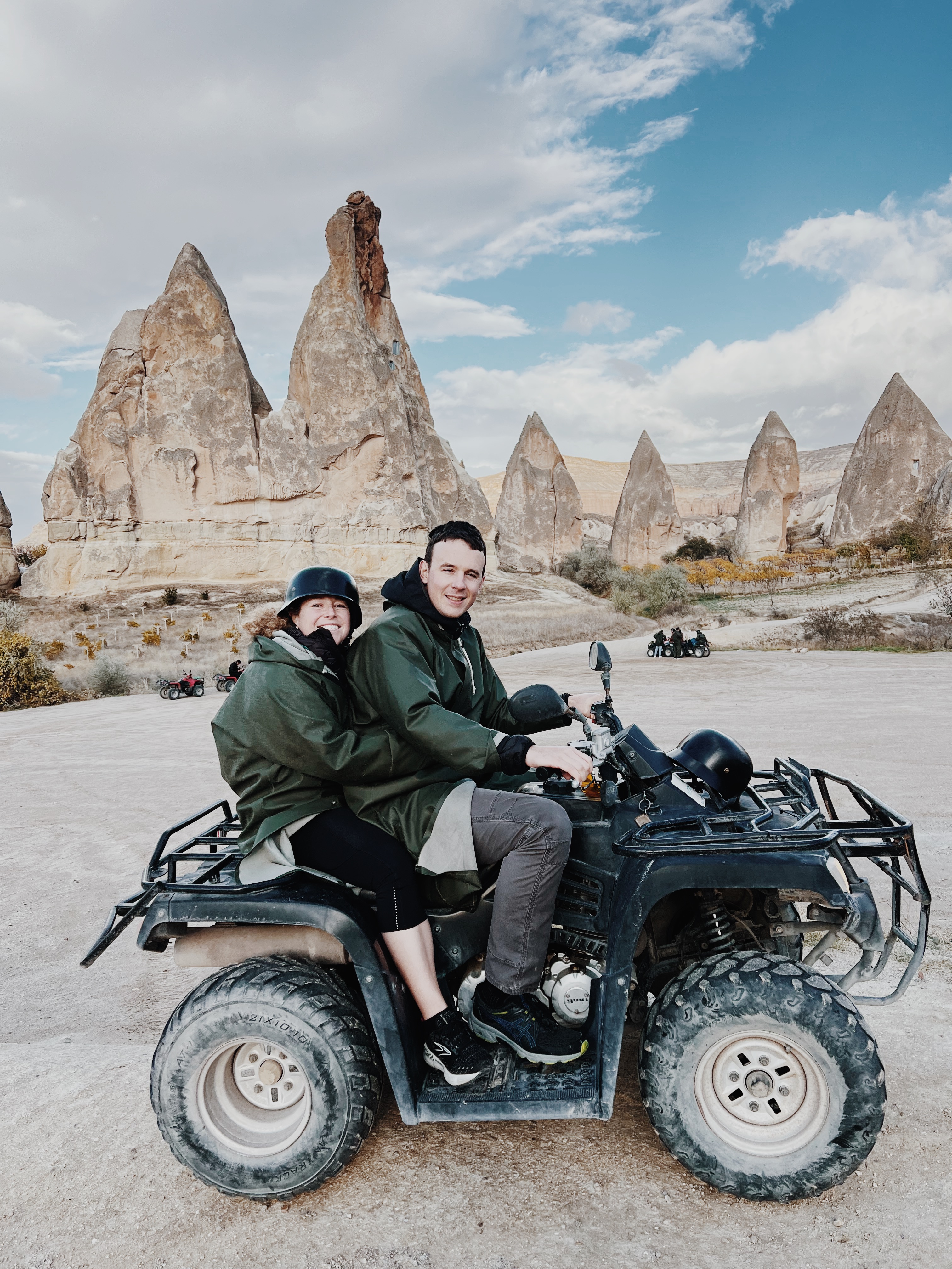 • Sunset ATV ride – This started out not that fun as it was freezing cold (we were here in November) and it was raining… not a recipe for success. They gave us rain jackets, but the weather literally put a damper on the experience. However, the weather turned a little clearer by the end and we did get to explore a few awesome views/sites in the end, including Rose Valley, Love Valley, & Red Valley. Unfortunately the clouds ruined any chance of a sunset, but we still enjoyed the experience. Maybe just check the weather before you book! Here’s an example of a tour (although we just booked ours through our hotel the night before).