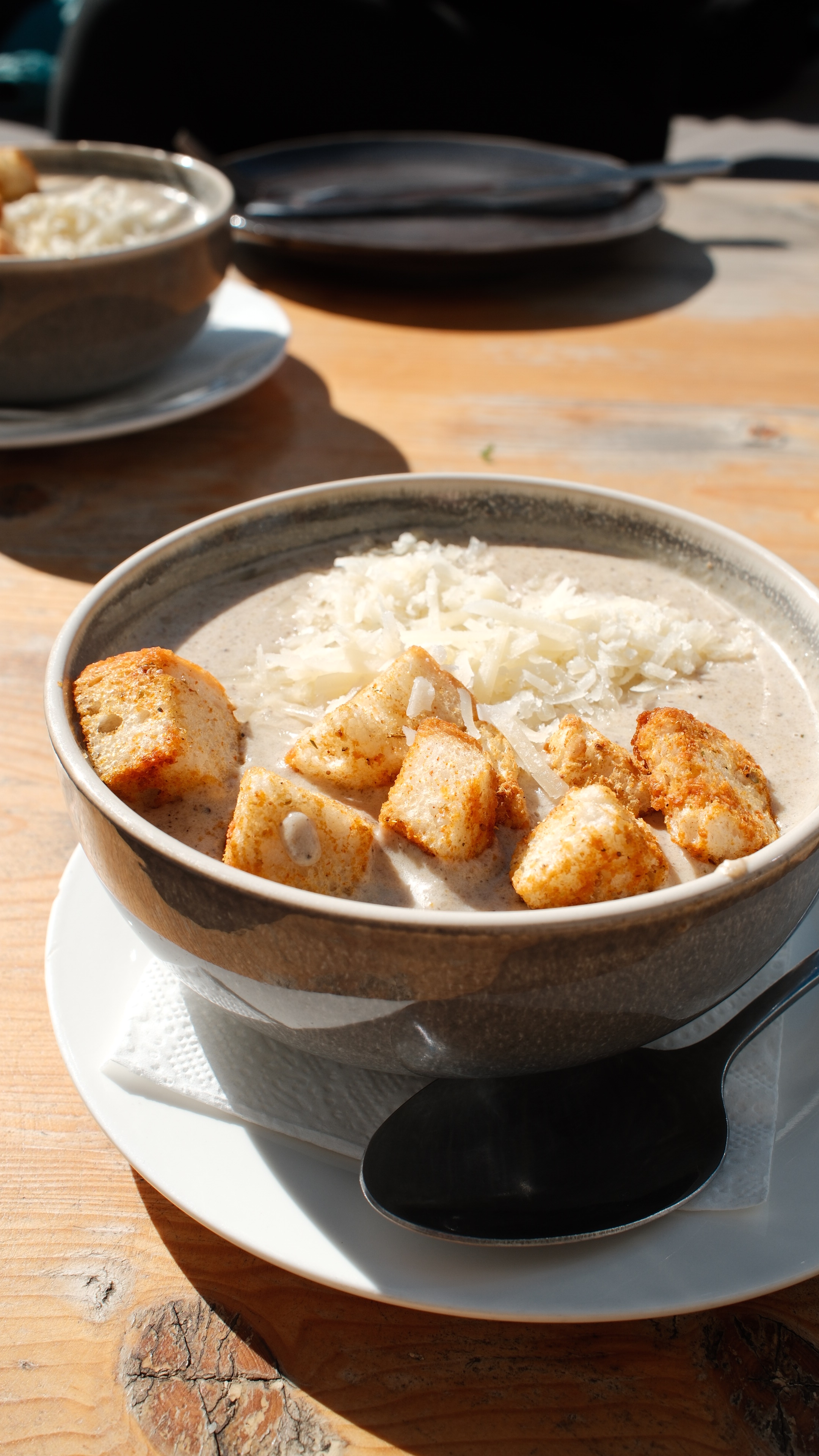- Dootsi – great for lunch or dinner. After our big hike to the Trinity Church, the three Slovenian gals I met on my bus here from Tbilisi & I headed here for a hearty lunch. As per usual we got some khinkali to share. It was my first time trying the cheese khinkali (normally I’ve order the meet one) and I really enjoyed it! This place has a big deck with stunning views of the Trinity church and MT Kazbek (as long as it’s clear).