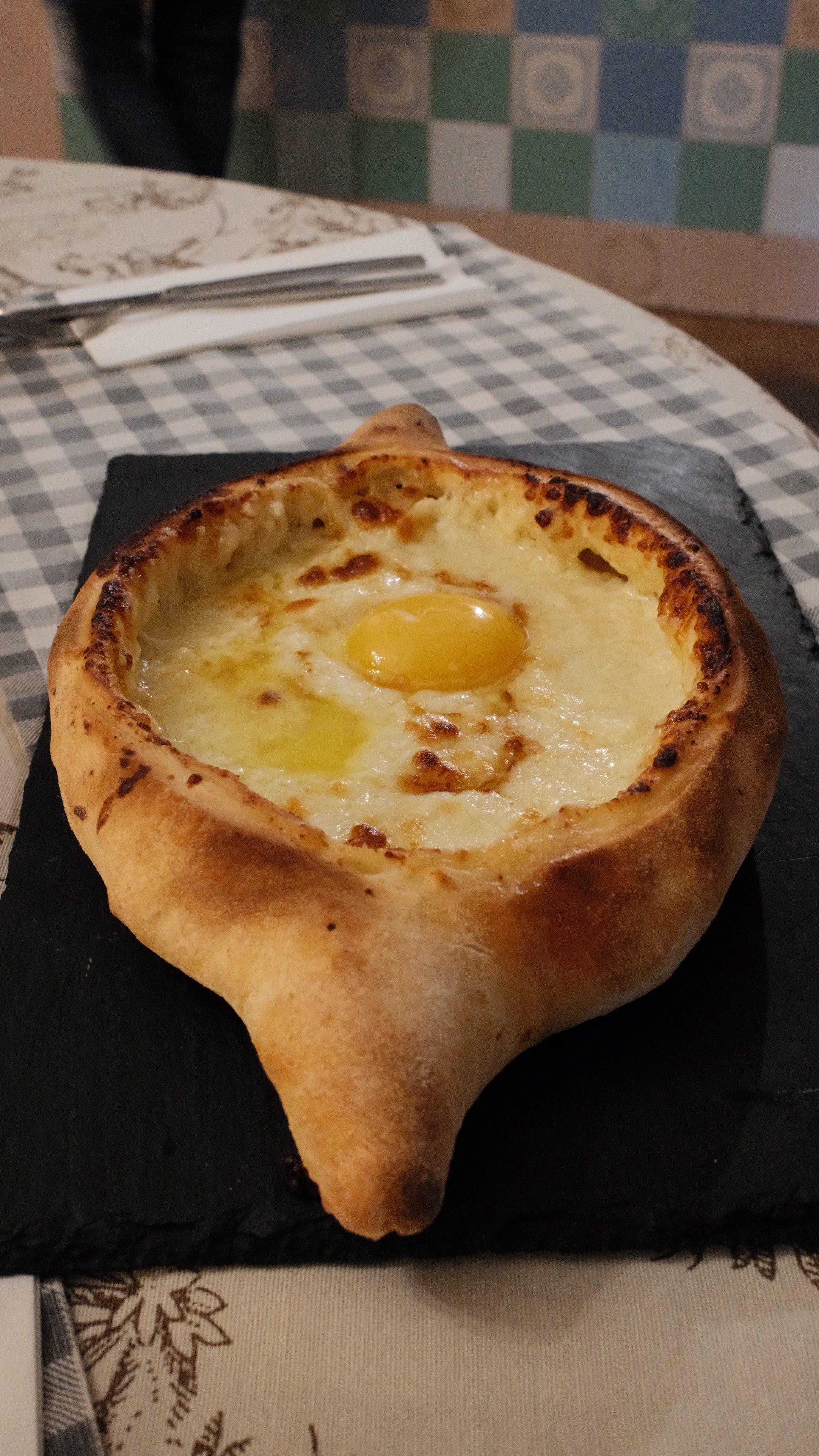 - Adjarian khachapuri – the only non-circular Khachapuri. This one is in a boat shape with a raw egg + pad of butter they throw in right as it comes out of the oven. Then you mix it all together inside the bread boat so it all cooks. You eat it by ripping off pieces of the bread boat and then dip it into the cheese/egg mixture.