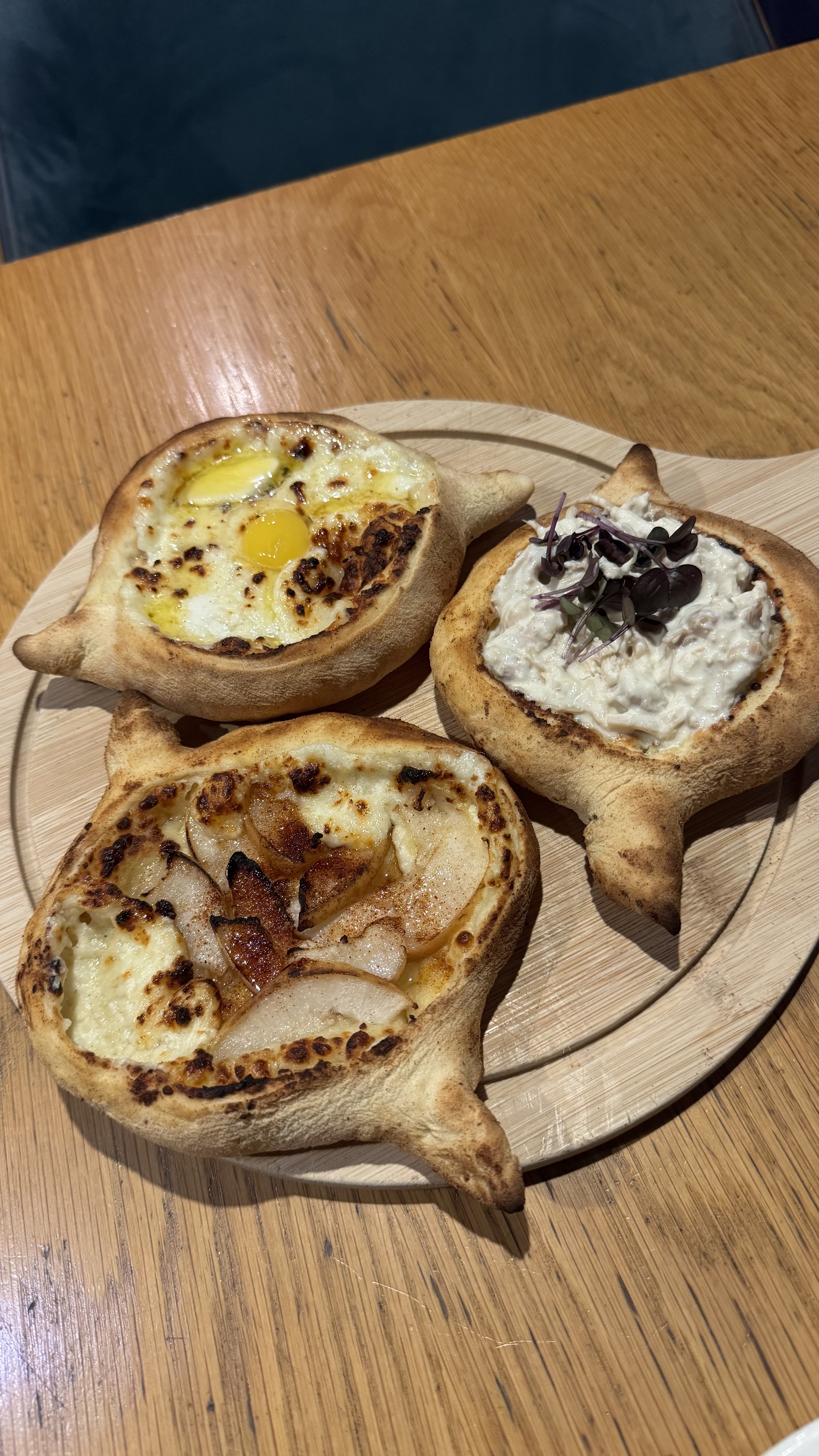 - Mingrelian khachapuri- looks like pizza without red sauce. This version is HEAVY on the cheese so obvi I loved it, but it might be a bit much for most folks.