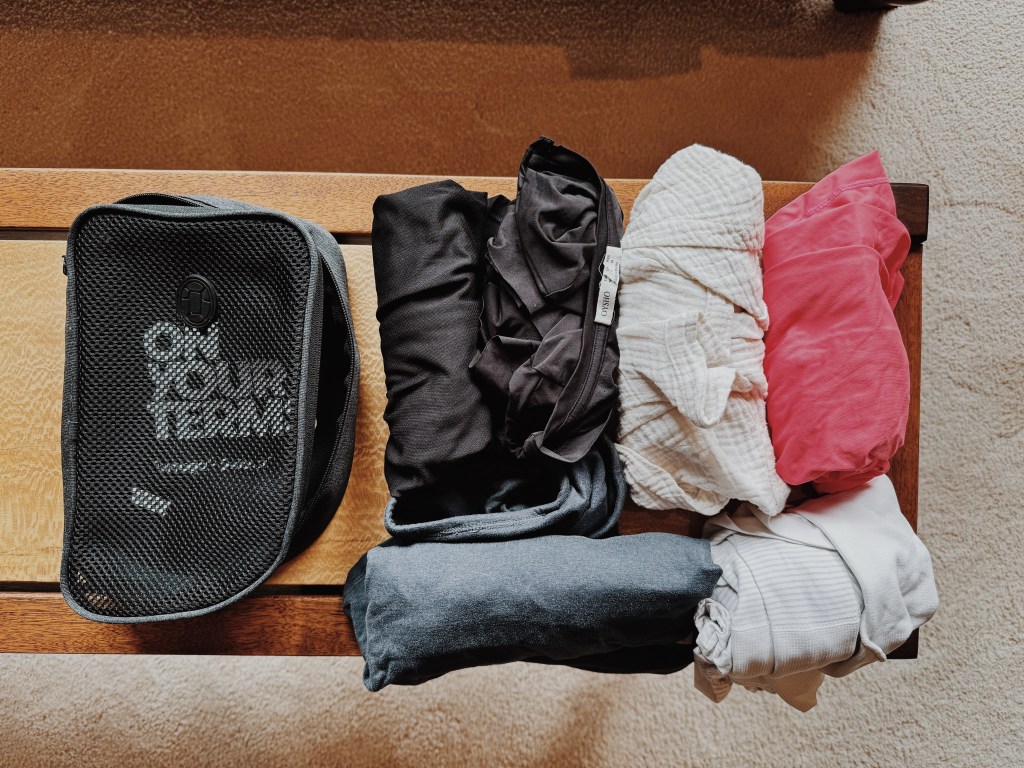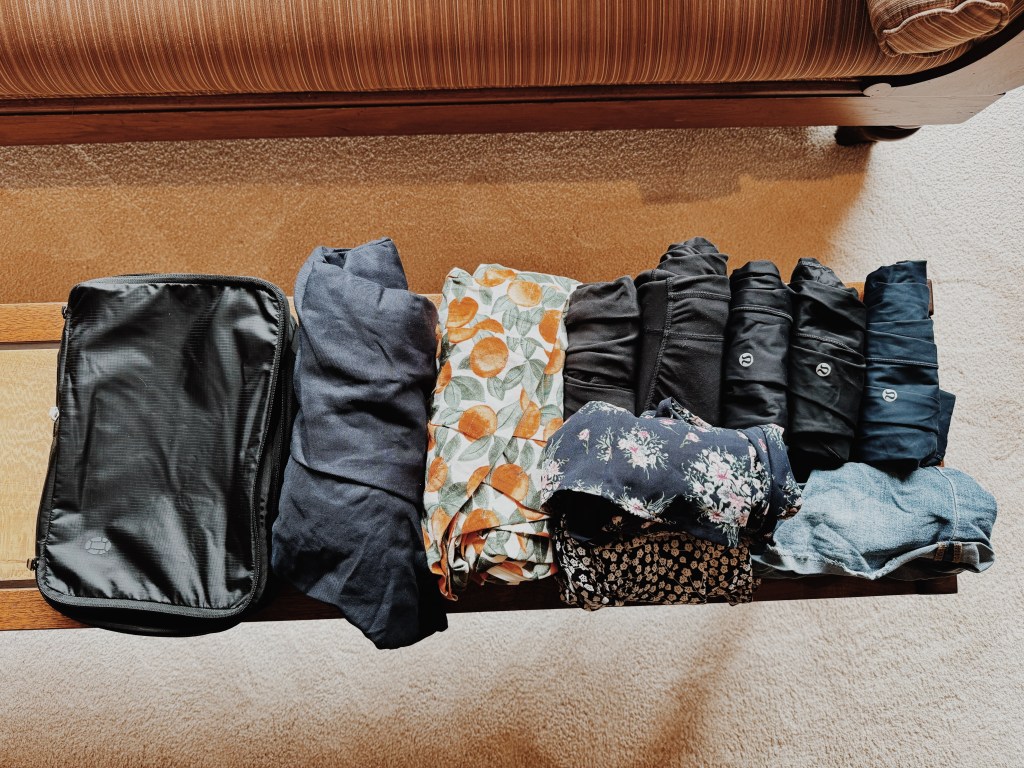 Swimsuit, 3 sports bras, 8 socks, booty shorts, bralette5 shirtsTwo jumpsuits, two rompers, jean shorts, 5 pairs of leggingsPacking cubes all packedAll packed up! 40L Tortuga Lite Backpack, Tortuga Packable daypack (personal item), Tortuga Sling bag, and my airport outfitBack on the road, all decked out in Tortuga gear 🙂